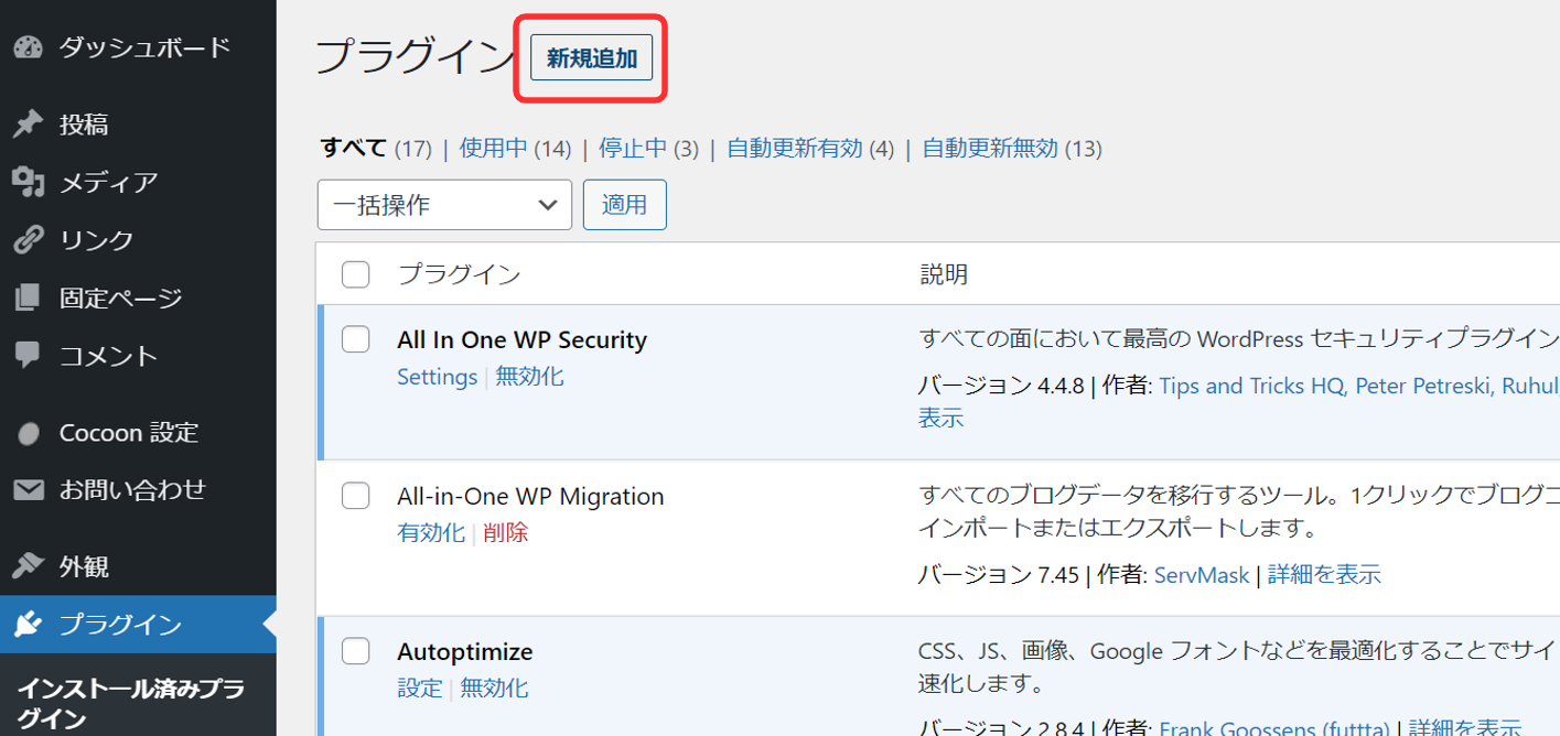 WordPressの管理画面から、プラグインをクリックし新規追加ボタンをおします。