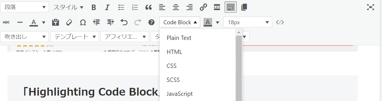 ビジュアルモードのこの部分でHighlighting Code Blockのコードブロックを挿入できます。